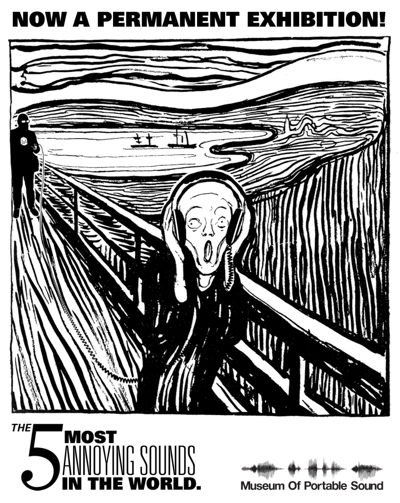 Our exhibition presents the five most annoying sounds in the world – the same recordings used in the studies – each played over and over again for exactly one minute, beginning with the least annoying and ending with the scientifically determined Most Annoying Sound in the World.