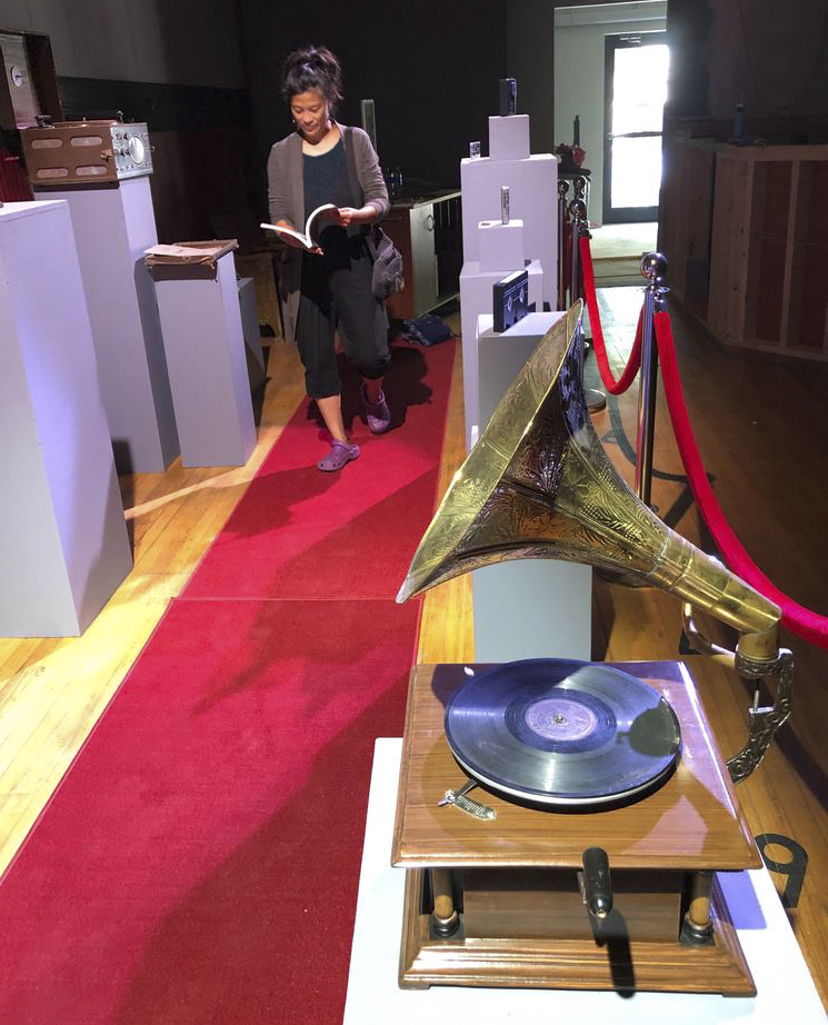 What if, she asked, she put together a physical ‘museum of portable sound’ exhibit in the theatre space using her own collection of vintage audio gear, at the end of which visitors would find a table containing a computer with our Director appearing live by video chat (as we had already begun doing) to present a guided tour of the actual Museum of Portable Sound?