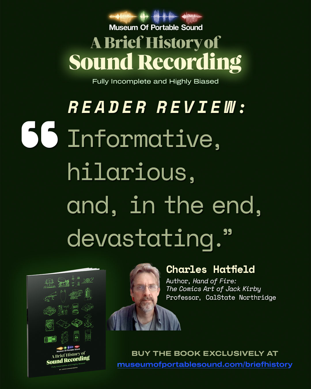 Ten years in the making, this 120-page FULL COLOUR book covers the history of sound recording from our museum’s unique perspective, a guide to 36 sound recordings from our Permanent Collection of Sounds, dozens of photos of our Physical Objects Collection, a Timeline of Sound Recording, and 30+ Listening Close-Up essays–all to bring you a history that’s deeply researched and highly unconventional.