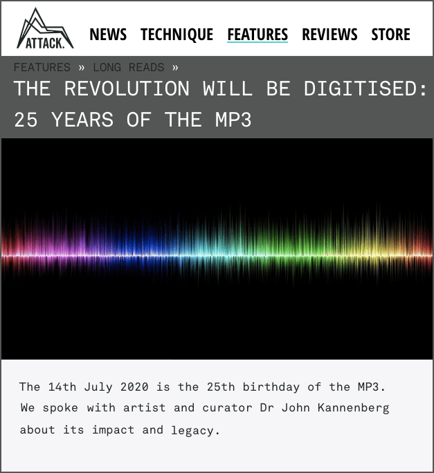 Read an interview with exhibition curator Dr John Kannenberg about the history and legacy of the MP3 which was published by Attack Magazine on the date of the 25th anniversary of the MP3.