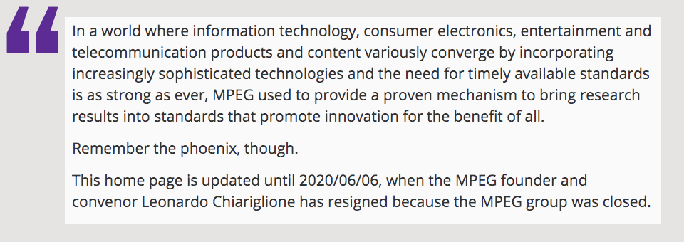 Not to be overlooked is the shocking resignation of MPEG founder Leonardo Chiariglione, who declared the organisation ‘closed’ and moved its website to his own personal web server just over a month before the MP3’s 25th anniversary, casting the future of audiovisual standards in doubt.