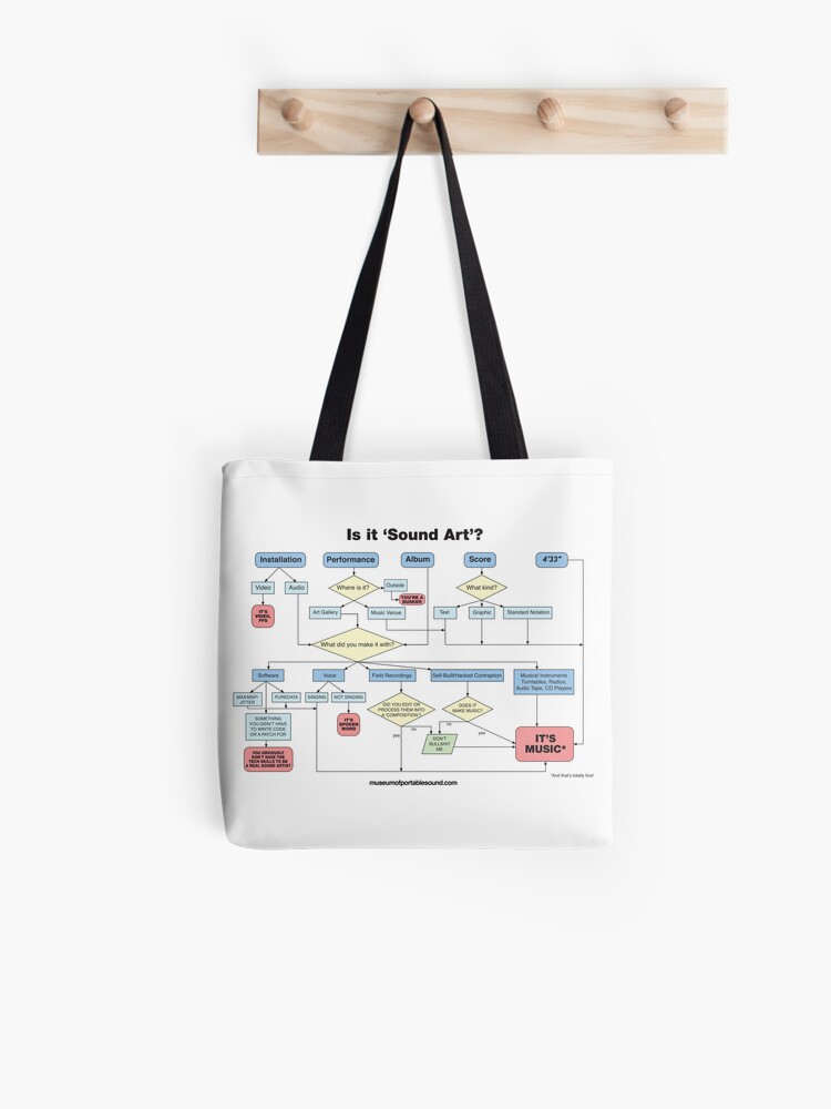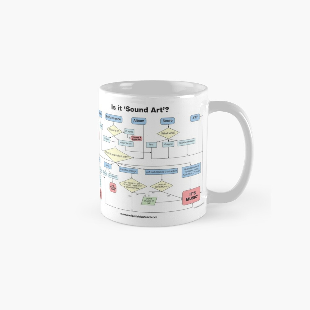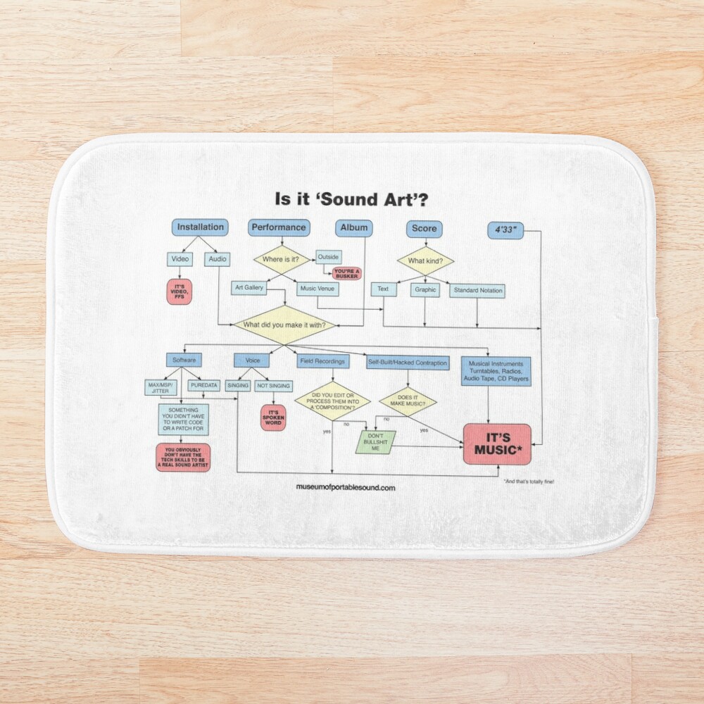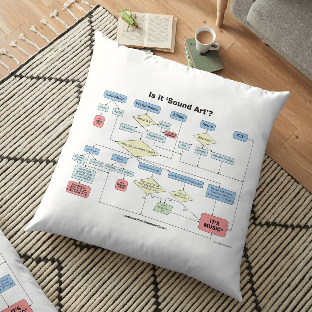 Endorsed by leading experts in the pages of The Bloomsbury Handbook of Sound Art, our flowchart can be found gracing t-shirts, posters, greeting cards, mugs, stickers, tote bags, pillows, pouches, and more – all available for purchase in the official Museum of Portable Sound Gift Shop at Redbubble.