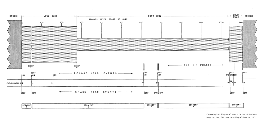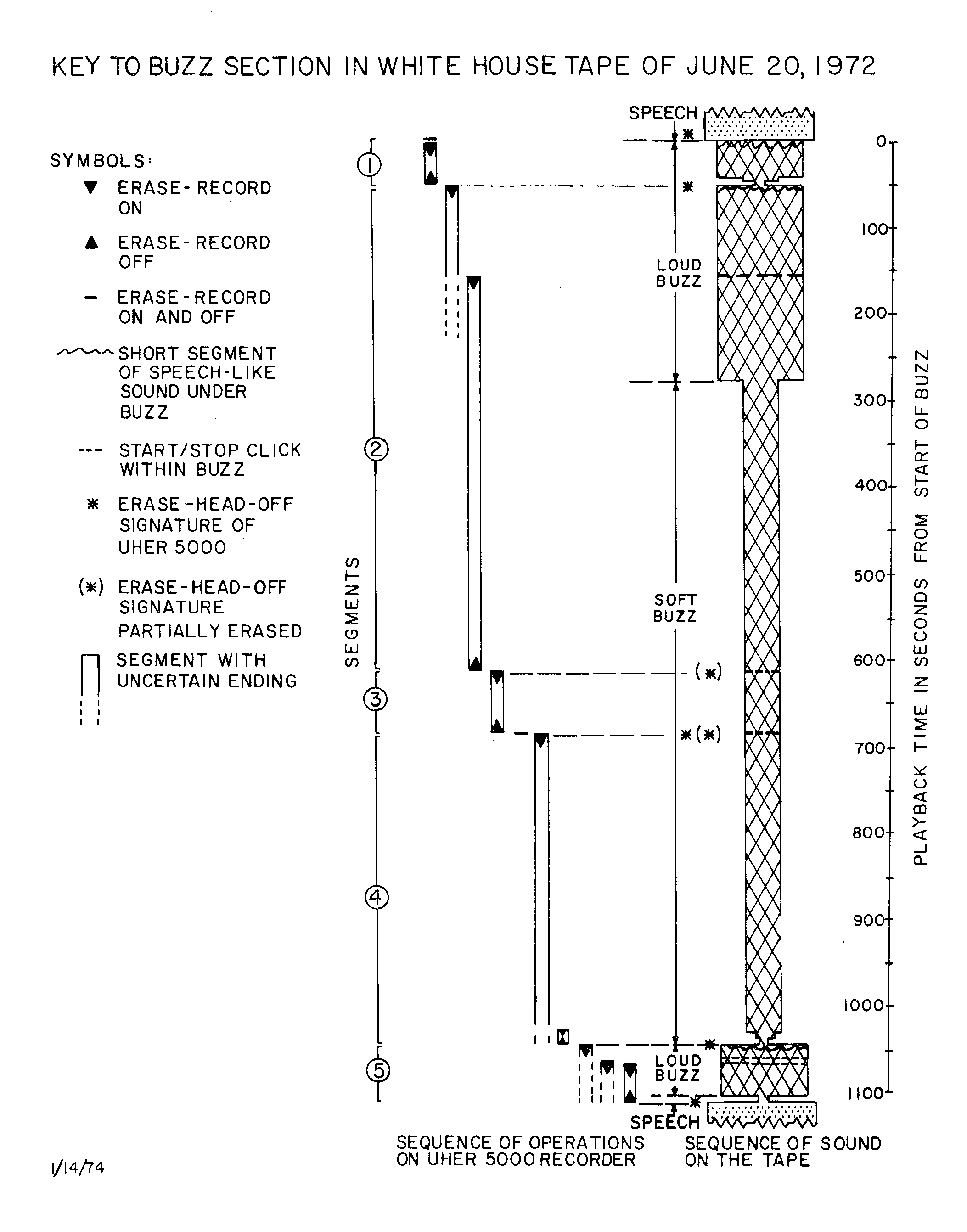 In November 1973 Judge John Sirica, in whose courtroom Rose Mary Woods testified, commissioned a team of six slightly more reputable audio experts to investigate the missing 18 and a half minutes. The experts – Richard H. Bolt, Franklin S. Cooper, James L. Flanagan, John G. (Jay) McKnight, Thomas G. Stockham Jr., and Mark R. Heiss – produced a detailed Technical Report which went on to become something of a text book for the then-newly developing field of forensic audio. Their report produced two detailed diagrams of the audio events contained on the portion of tape 342 that had been erased.