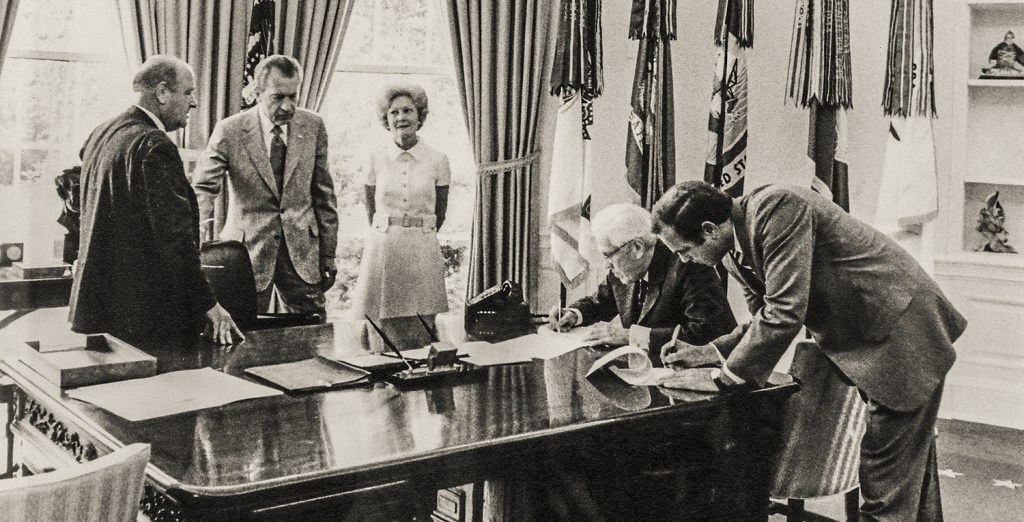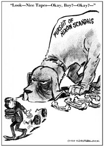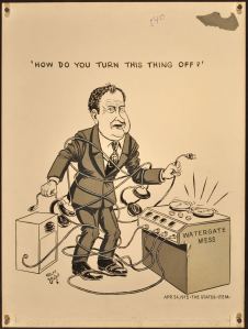 After members of Nixon’s Committee To Re-Elect the President (CREEP) were caught illegally breaking into the Watergate Hotel in order to wiretap and raid the offices of the Democratic party’s national headquarters, the president and his team were increasingly unable to successfully contain the political fallout (primarily due to a stunning lack of competence on the part of most of the people involved) and the White House was rocked by scandal that began spiralling out of control.