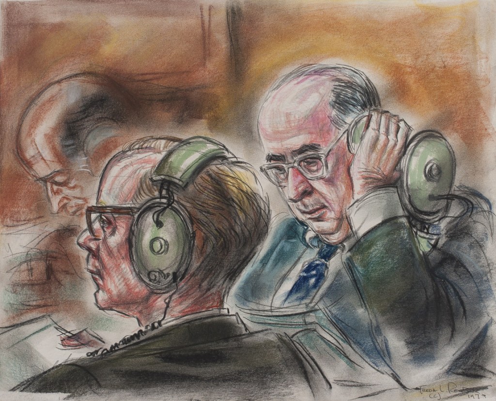 Throughout the course of the Watergate investigations, the Koss Pro/4AAs were the headphones of choice for the United States Congress as well as the courtroom of Judge John Sirica. The captivating courtroom drawings of the US ABC television network artist Freda Leibowitz Reiter (1919–1986) seen above were shown on television from 1973–1975, preserving the ubiquitous courtroom use of the Pro/4AAs due to her detailed depiction of their distinctive design, right down to the giant knob on the outside of the left ear cup that could be unscrewed to attach a headset microphone to the phones.