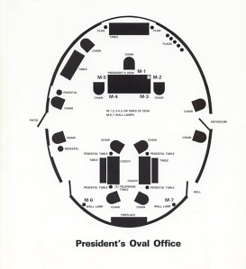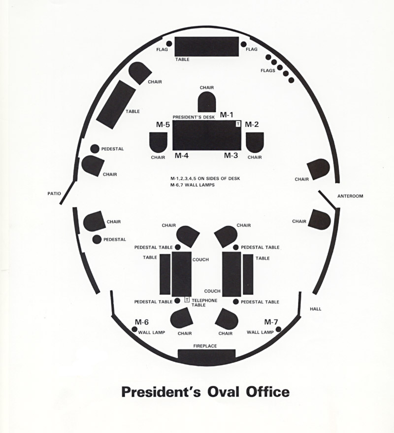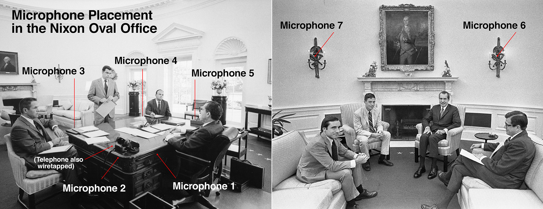 According to a map of the tape system made from information provided by Bob Haldeman, there was a total of seven microphones hidden in the Oval Office (not counting the wiretap on the President’s telephone). Five of the microphones were attached to the outside of Nixon’s desk. The other two were hidden in the wall-mounted lamps on either side of the fireplace.