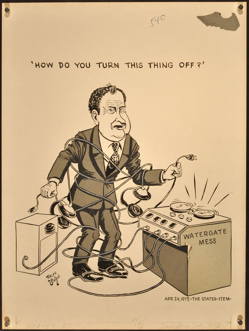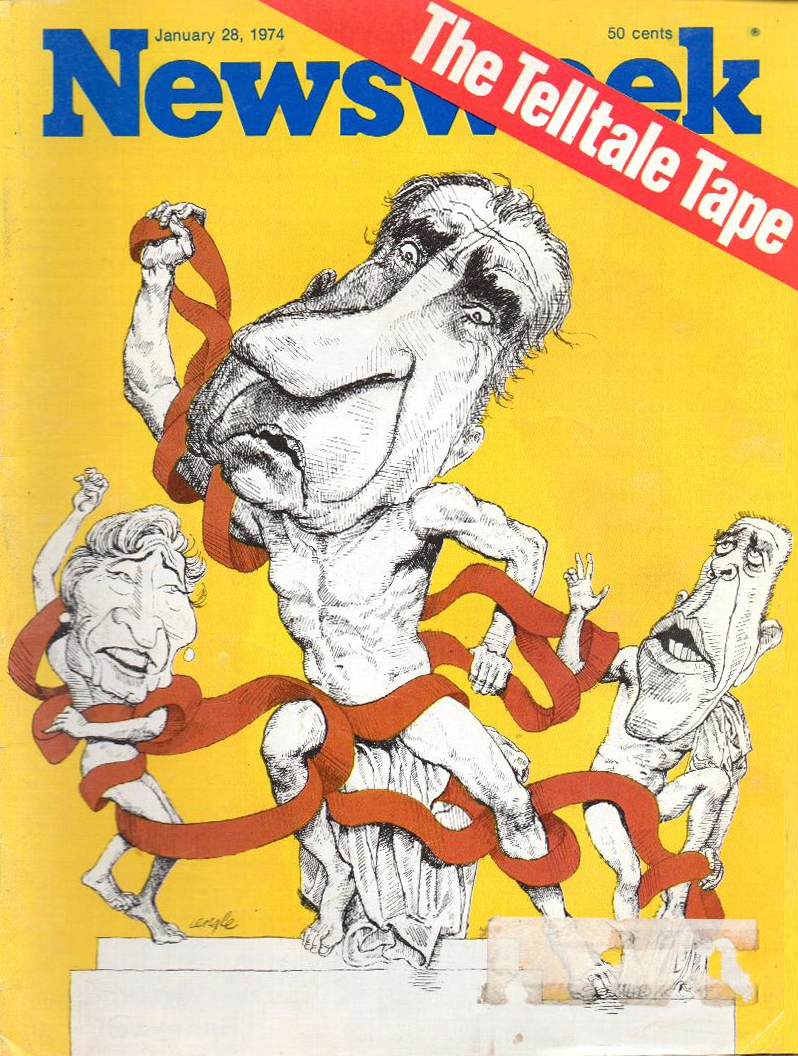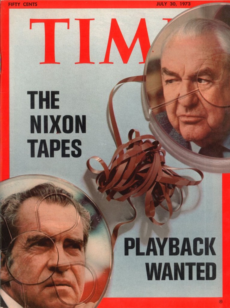 After the revelation of Nixon’s secret taping system, the concept of ‘the tapes’ as a visual shorthand for corruption and conspiracy entered the visual culture of the United States. Beginning with the country’s weekly news magazines Newsweek and Time, the iconography of reel to reel tape recorders and their spools of tape ignited a pervasive visual syncretism between magnetic tape and legal entanglement within popular culture.