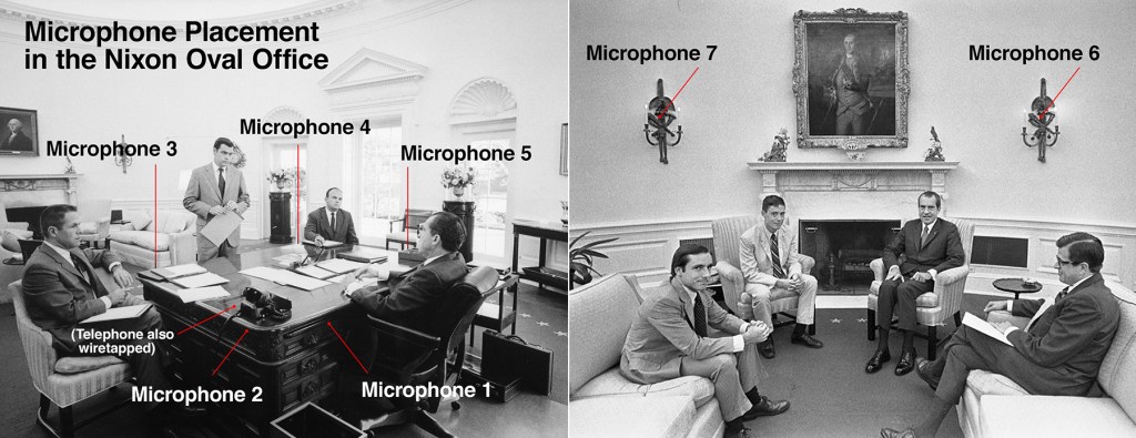 Outside the Oval Office, there were microphones installed in the wall sconces of the Cabinet Room, and the telephone in the Lincoln Sitting Room was also tapped.