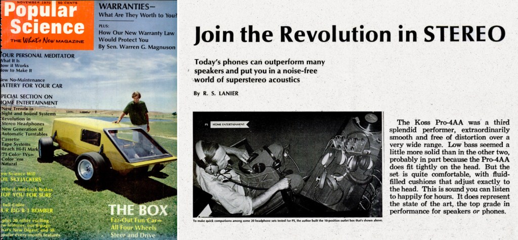 “The Koss Pro/4AA was a . . . splendid performer, extraordinarily smooth and free of distortion over a very wide range. Low bass seemed a little more solid than in the other two [reviewed headphones], probably in part because the Pro/4AA does fit tightly on the head. But the set is quite comfortable, with fluid-filled cushions that adjust exactly to the head. This is sound you can listen to happily for hours. It does represent the state of the art, the top grade in performance for speakers or phones.” (R.S. Lanier)