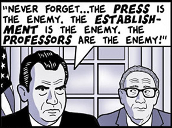 While Nixon’s primary interest in making the recordings was for posterity, he had other reasons for finding them useful. He preferred not to have a note taker present during meetings, so the recordings were to be a memory aid and a reference for finessing public messaging to the press, which he viewed as “the enemy”. However, being naturally paranoid, Nixon also found it advantageous to have a record of what his staff said in order to keep track of their opinions about him, his policies, and their personal lives – lest any of them ever turn on him.