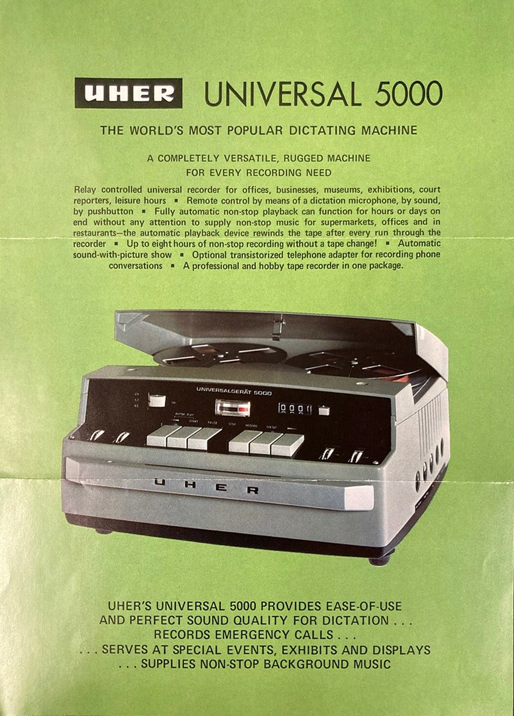 What the Uher 5000 may have lacked in sound quality, it made up for in extra functionality: it was a hybrid tape recorder and dictaphone, with remote operation possible via the use of foot pedals. This made it an essential office tool, as mentioned in the vintage sales sheet reproduced here.